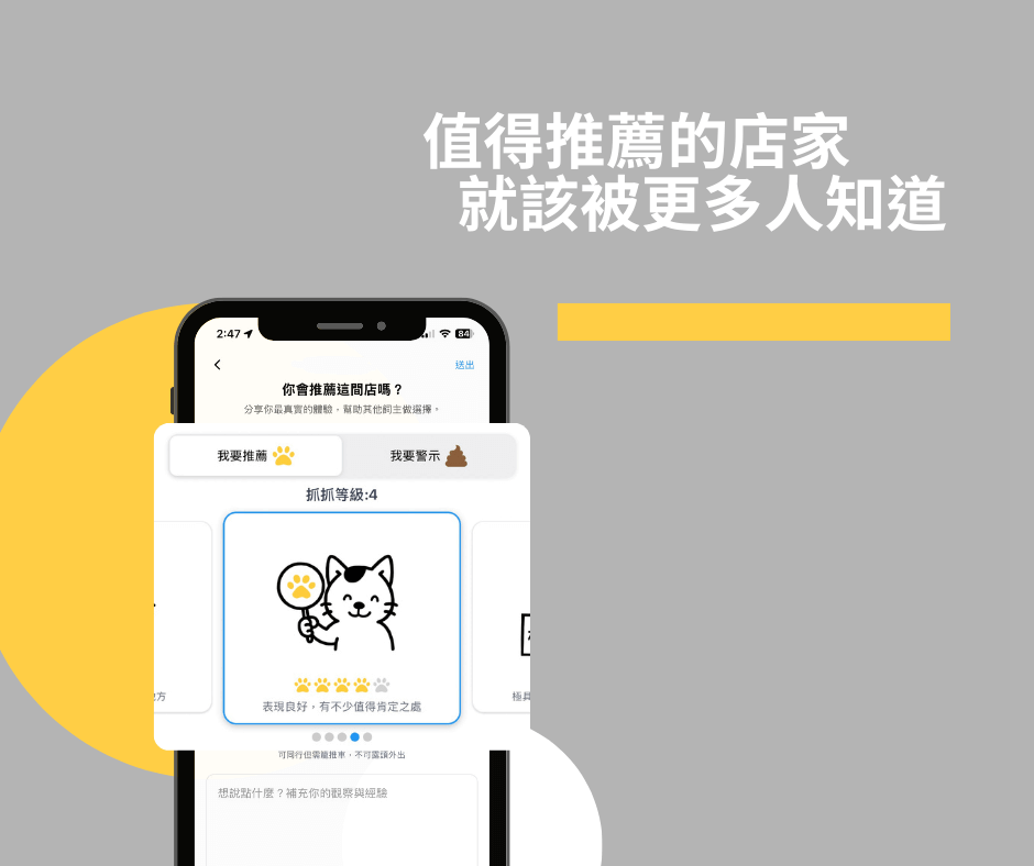 透過「抓抓」與「便便」評分,對不同類型店家留下心得。系統中立透明,幫助用戶避開風險,也讓值得推薦的店家被更多人看見。